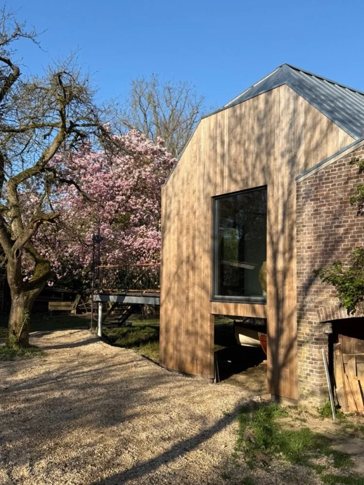 De aanbouw is toegevoegd aan de karakteristieke watermolen van Geysteren en vormt een eigentijdse uitbreiding in een unieke landschappelijk. Het nieuwe volume is zorgvuldig vormgegeven als een duidelijke, maar bescheiden toevoeging naast het historische metselwerk. Met hout als hoofdmaterialisatie sluit de uitbreiding aan bij het natuurlijke karakter van de omgeving en blijft de molen dominant aanwezig. Grote raamopeningen zijn bewust geplaatst om uitzichten over het landschap te vangen en het daglicht maximaal binnen te brengen. De overgang tussen oud en nieuw is verfijnd gedetailleerd, zodat beide tijdlagen naast elkaar leesbaar blijven. Zo ontstaat een uitbreiding die het wooncomfort vergroot en tegelijk de beleving van de molen en haar plek versterkt.