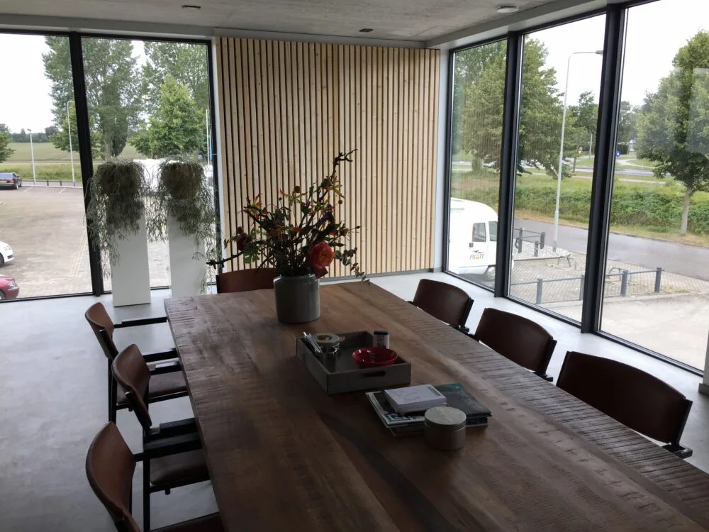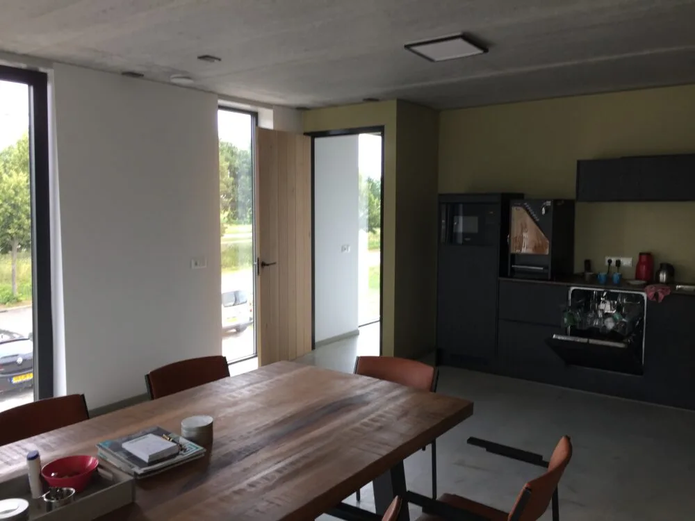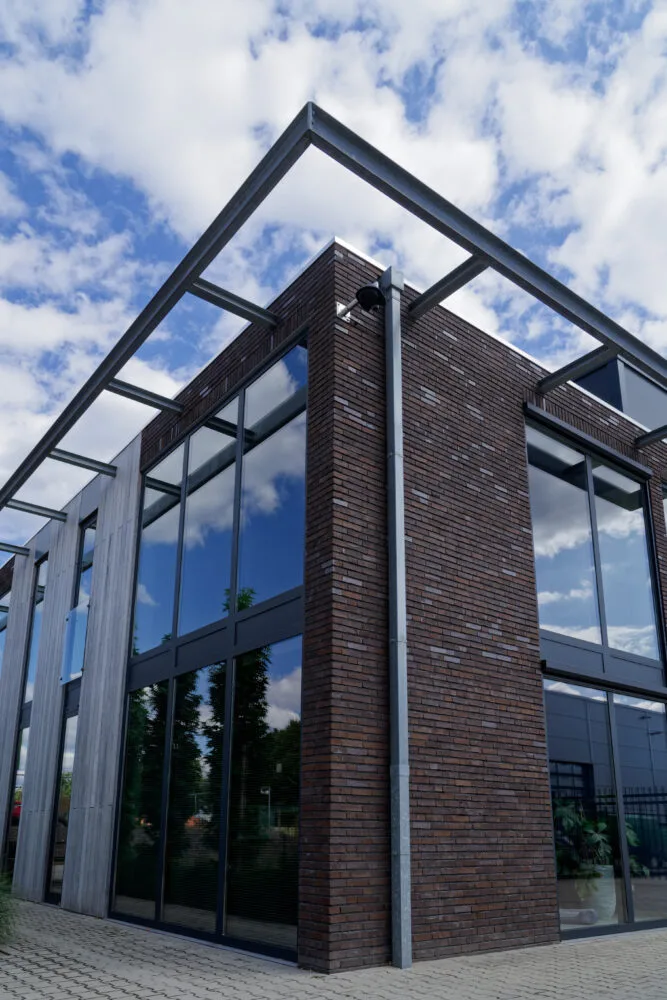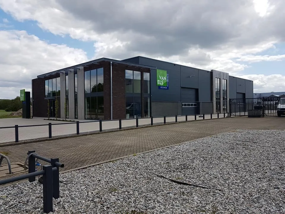 Dit nieuwbouw bedrijfsgebouw is ontworpen als een representatieve huisvesting voor een aannemer, met een ruime hal en heldere werkfuncties. De architectuur is strak en eigentijds en een krachtige, industriële uitstraling. Baksteen, verticale houtaccenten en grote glasvlakken zorgen voor een warme materialisering en een herkenbaar gevelbeeld. De hoge raamopeningen bieden vanuit de kantoorruimtes mooie uitzichten over de omgeving. De overstekken en de ritmiek in de gevel brengen schaduwwerking en diepte, waardoor het gebouw verfijnd oogt. Zo is een functioneel en duurzaam bedrijfsgebouw gerealiseerd dat werkcomfort combineert met een sterke, professionele uitstraling.